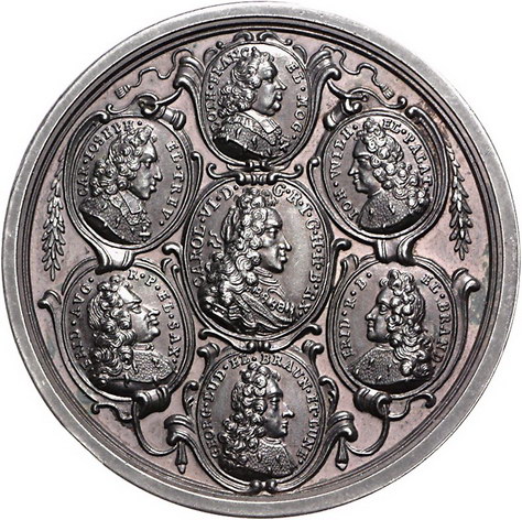 Los-Nummer: Auktion 51 - 2163 Haus Habsburg Haus Habsburg Karl VI. 1711-1740, Medaille 1711, von P.H. Müller. Auf seine Krönung. Brustbild des Kaisers in ovalem Medaillon umgeben von sechs Medaillons mit den Brustbildern der sechs Kurfürsten / Reichsadler. Slg. Montenuovo 1369 , Förschner 163, J.u.F. 661, Forster 774. 48,5 mm, 46,80 g. Schöne Patina. Vorzüglich - Stempelglanz Schätzpreis: 900,- Zuschlag: 725,- |