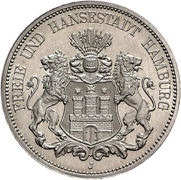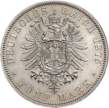 Los-Nummer: Auktion 51 - 2611 Münzen des Deutschen Kaiserreichs Hamburg 5 Mark 1875 J. Jaeger 62. Berieben, vorzüglich Schätzpreis: 250,- Zuschlag: unverkauft |