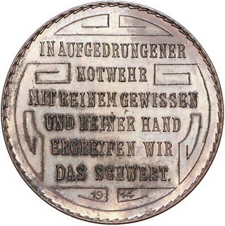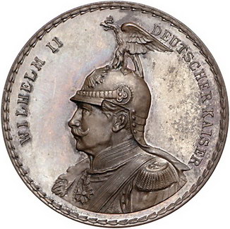 Los-Nummer: Auktion 51 - 2357 Medaillen Münchner Medailleure Goetz, Karl Bronzemedaille 1914. Auf den Ersten Weltkrieg. Brustbild Wilhelm II. von Preußen in Uniform und mit Adlerhelm nach links / Sechs Zeilen Schrift. Kienast -. 33,5 mm. Polierte Platte. Vorzüglich - Stempelglanz Schätzpreis: 250,- Zuschlag: unverkauft |