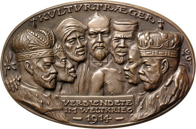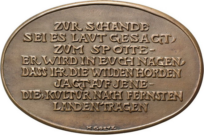 Los-Nummer: Auktion 51 - 2355 Medaillen Münchner Medailleure Goetz, Karl Ovale Bronzegussmedaille 1914. Kulturträger - Verbündete im Weltkrieg. Poincaré umarmt seine Verbündeten, König Georg V. von Großbritannien und Kaiser Nikolaus von Russland, und weitere Helfer: einen Senegalesen, einen Turkmenen, einen Zuaven und einen Japaner / Acht Zeilen Schrift. Kienast 140. 90,5 x 60 mm. Vorzüglich Schätzpreis: 200,- Zuschlag: 250,- |