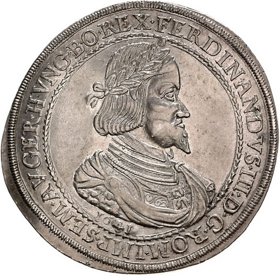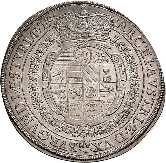 Los-Nummer: Auktion 51 - 2056 Haus Habsburg Haus Habsburg Ferdinand III. 1637-1657, Doppeltaler 1641, Graz. Jahreszahl im Stempel aus 1639 geändert. Belorbeertes Brustbild nach rechts, unten Jahreszahl / Gekröntes und mit Vlieskette behangenes vielfeldiges Wappen. Herinek 341, Davenport 291. Prachtexemplar. Vorzüglich + Schätzpreis: 2500,- Zuschlag: 2400,- |