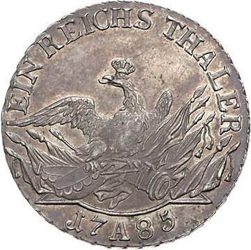 Los-Nummer: Auktion 51 - 414 Altdeutsche Münzen und Medaillen Brandenburg-Preußen Friedrich II. 1740-1786, Taler 1785 A, Berlin. Belorbeertes Greisenantlitz nach rechts / Adler auf Trophäen. Olding 70, Davenport 2590. Schöne Patina. Minimal justiert, vorzüglich + Schätzpreis: 175,- Zuschlag: 185,- |