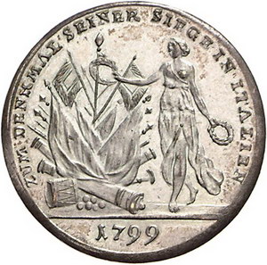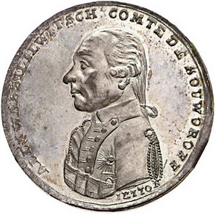 Los-Nummer: Auktion 51 - 3752 Ausländische Münzen und Medaillen Russland Paul I. 1796-1801, Versilberter Bronzejeton#0Medaille# 1799. Auf den Feldmarschall Graf Suvorov und den Übergang über die Adda. Brustbild nach links / Viktoria bekränzt Kriegstrophäen. Diakov - , Slg. Julius 702, Hennin 906. 31 mm. Prachtexemplar. Fast Stempelglanz Schätzpreis: 400,- Zuschlag: unverkauft |
