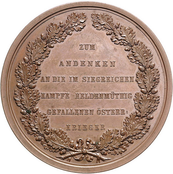 Los-Nummer: Auktion 51 - 1755 Altdeutsche Münzen und Medaillen Schleswig-Holstein, königliche Linie Der deutsch-dänische Krieg, Bronzemedaille 1864, von Roth. Zur Erinnerung an die österreichischen Gefallenen des deutsch-dänischen Kriegs. Trauernder Genius lehnt rechts an Postament mit Urne und behelmtem Wappenschild, links Löwe vor Kriegstrophäen / Sechs Zeilen Schrift in Eichenkranz. Wurzbach 6925 , Horsky 3783. 70 mm. Winz. Kratzer, vorzüglich + Schätzpreis: 150,- Zuschlag: 140,- |