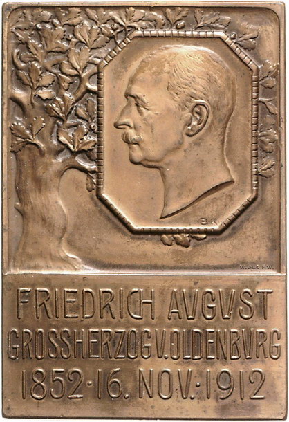 Los-Nummer: Auktion 51 - 1326 Altdeutsche Münzen und Medaillen Oldenburg Friedrich August 1900-1918, Einseitige Bronzeplakette#0Medaille# 1912, signiert B.K. Auf seinen 60. Geburtstag. Eichbaum, davor Achteck mit Darstellung seines Kopfes nach links, unten drei Zeilen Schrift. 62,5 x 42,5 mm. Vorzüglich Schätzpreis: 250,- Zuschlag: unverkauft |