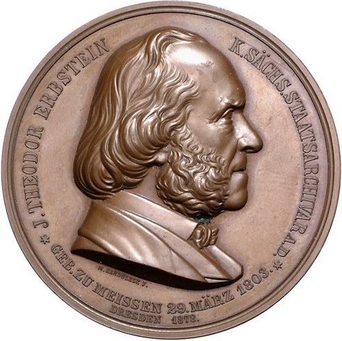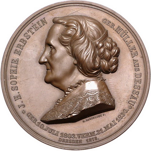 Los-Nummer: Auktion 51 - 2428 Medaillen Numismatik Personen Erbstein, Julius Theodor *1803 Meißen, +1882 Dresden, Bronzemedaille 1878, von Barduleck. Auf seine Goldene Hochzeit mit J.H. Sophie Erbstein geb. Müller aus Dessau. Sein Brustbild nach rechts / Ihr Brustbild nach links. 50 mm. Prägefrisch Schätzpreis: 200,- Zuschlag: 250,- |
