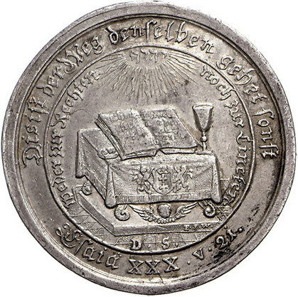 Los-Nummer: Auktion 51 - 3632 Ausländische Münzen und Medaillen Polen-Danzig Medaillen und Marken, Medaille 1730 (Chronogramm), von P.P. Werner und D. Sievert. Auf das Konfessionsjubiläum. Buch und Kelch auf Altar mit Danziger Wappen / Schrift. Slg. Marienburg 8730, H.-Cz. 2679, Dutkowski/Suchanek 625 , Slg. Whiting 385, Slg. Erlanger 2892, Slg. Belli 1977. 43 mm, 26,64 g. Sehr schön Schätzpreis: 200,- Zuschlag: 167,- |