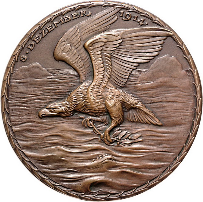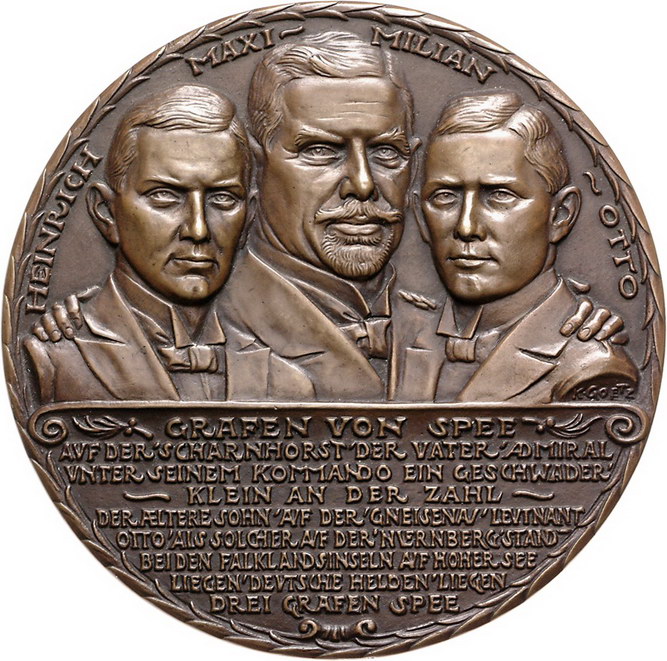 Los-Nummer: Auktion 51 - 2359 Medaillen Münchner Medailleure Goetz, Karl Bronzegussmedaille 1914. Auf die Grafen von Spee. Die Brustbilder der drei Grafen von Spee fast von vorn neun Zeilen Schrift / Fliegender Adler mit Lorbeerzweig über Meer und Felsen. Kienast 146 , Zetzmann 6008 (44,5 mm, Ag). 102,5 mm. Vorzüglich - prägefrisch Schätzpreis: 300,- Zuschlag: unverkauft |