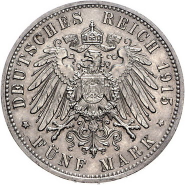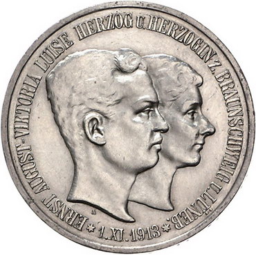 Los-Nummer: Auktion 51 - 2602 Münzen des Deutschen Kaiserreichs Braunschweig Ernst August 1913-1916, 5 Mark 1915 A. Regierungsantritt. Mit Lüneburg. Jaeger 58. Rand leicht bearbeitet, vorzüglich Schätzpreis: 300,- Zuschlag: unverkauft |