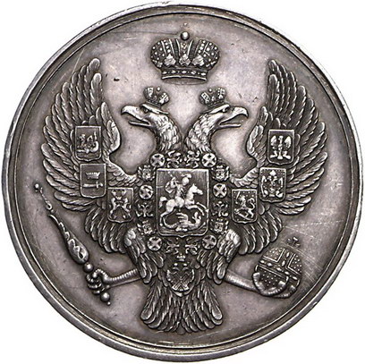 Los-Nummer: Auktion 51 - 3811 Ausländische Münzen und Medaillen Russland Nikolaus I. 1825-1855, Allgemeine Preismedaille o.J., unsigniert, von Sizorsky und Baranov? Gekrönter Doppeladler / Stehende Minerva vor Gegenständen der Gewerbe. Diakov 523.3. 43 mm, 25,48 g. Fast vorzüglich Schätzpreis: 250,- Zuschlag: 200,- |