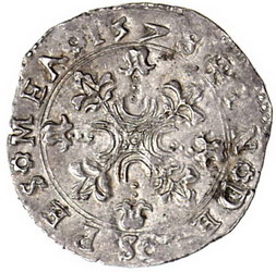 Los-Nummer: Auktion 51 - 3212 Ausländische Münzen und Medaillen Italien-Messerano Besso Ferrero Fieschi 1559-1584, Bianco 1578. Gekröntes vierfeldiges Wappen mit Mittelschild zwischen Rosetten / Blumenkreuz. CNI 2.331.66, Varesi 740/4. Vorzüglich Schätzpreis: 1000,- Zuschlag: 1200,- |