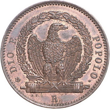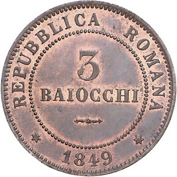 Los-Nummer: Auktion 51 - 3232 Ausländische Münzen und Medaillen Italien-Römische Republik Cu 3 Baiocchi 1849, Rom. CNI 7, Pagani 343 a. Prachtexemplar. Fast Stempelglanz Schätzpreis: 500,- Zuschlag: unverkauft |