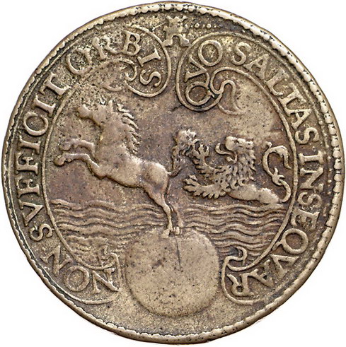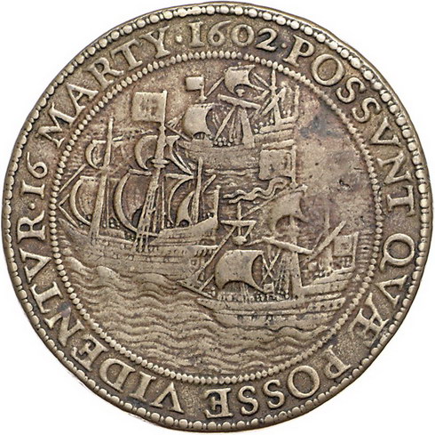 Los-Nummer: Auktion 51 - 3443 Ausländische Münzen und Medaillen Niederlande Bronzemedaille 1602, von J. Wittewaal. Auf die Eroberung des auf Reede vor St. Helena liegenden spanischen Schiffes St. Jacob durch die Seeflotte von G. de Mey und L. Bikter. Drei Segelschiffe / Von einem Erdball springendes Pferd, verfolgt von einem Löwen. Van Loon I, Seite 564 , KPK 451. 50,5 mm. Späterer Guss. Fast vorzüglich Schätzpreis: 100,- Zuschlag: 110,- |