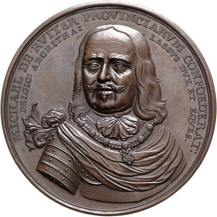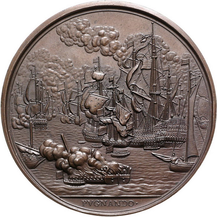 Los-Nummer: Auktion 51 - 3444 Ausländische Münzen und Medaillen Niederlande Bronzemedaille o.J. (um 1670), von Adolfszoon. Auf Admiral Michael de Ruiter und zum Gedenken an die so genannte Vier-Tage-Schlacht, in der er die niederländische Flotte kommandierte. Brustbild fast von vorn / Seeschlacht mit brennendem Schiff im Vordergrund. Van Loon III, 186. Med. Illustrations I, 522, 169. Eimer 239. 71 mm. Vorzüglich Schätzpreis: 150,- Zuschlag: 350,- |