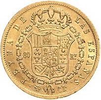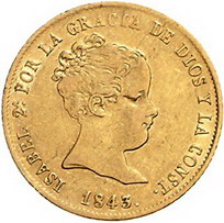 Los-Nummer: Auktion 51 - 4027 Ausländische Münzen und Medaillen Spanien Isabel II. 1833-1868, 80 Reales 1843 M/CL, Madrid. Calicó/Trigo 78, Friedberg 325. GOLD. Kl. Kratzer, sehr schön - vorzüglich Schätzpreis: 150,- Zuschlag: 185,- |