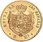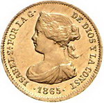 Los-Nummer: Auktion 51 - 4030 Ausländische Münzen und Medaillen Spanien Isabel II. 1833-1868, 2 Escudos 1865, Madrid. Calicó/Trigo 118, Friedberg 338. GOLD. Vorzüglich Schätzpreis: 100,- Zuschlag: 180,- |