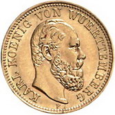 Los-Nummer: Auktion 51 - 2731 Münzen des Deutschen Kaiserreichs Württemberg Karl 1864-1891, 5 Mark 1877 F. Jaeger 291. GOLD. Winz. Randfehler, vorzüglich Schätzpreis: 350,- Zuschlag: unverkauft |