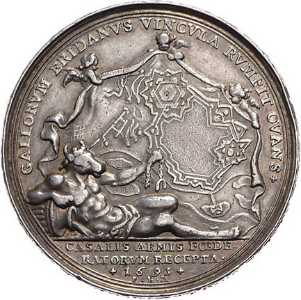 Los-Nummer: Auktion 51 - 2117 Haus Habsburg Haus Habsburg Leopold I. 1657-1705, Medaille 1695, von P.H. Müller und Kleinert. Auf die Eroberung von Casale durch Prinz Eugen. Italia mit Mauerkrone und Engel / Plan der Festung, davor Flussgott des Po mit Stierkopf. Slg. Montenuovo - , Slg. Julius 438 (Ag), Forster 692. 44 mm, 29,40 g. Sehr selten. Mit Randschrift. Randfehler, fast sehr schön Schätzpreis: 300,- Zuschlag: 240,- |