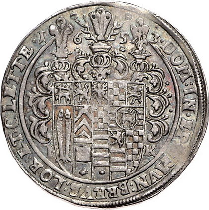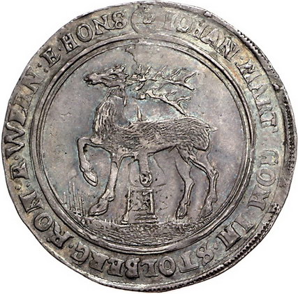 Los-Nummer: Auktion 51 - 1809 Altdeutsche Münzen und Medaillen Stolberg-Stolberg Johann Martin 1638-1669, Taler 1653, Rottleberode. Hirsch nach links vor Säule / Dreifach behelmtes Wappen. Friederich 1184, Davenport 7786. Schöne Patina. Fast vorzüglich Schätzpreis: 750,- Zuschlag: 1200,- |
