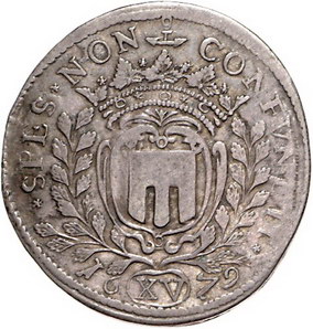 Los-Nummer: Auktion 51 - 1103 Altdeutsche Münzen und Medaillen Montfort, Grafschaft Johann VIII. 1662-1686, 15 Kreuzer 1679. Brustbild nach rechts / Gekröntes Wappen zwischen Zweigen. Ebner 122, Slg. Wurster 1526. Selten. Sehr schön Schätzpreis: 150,- Zuschlag: unverkauft |