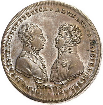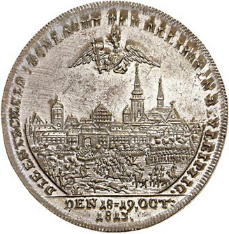 Los-Nummer: Auktion 51 - 3774 Ausländische Münzen und Medaillen Russland Alexander I. 1801-1825, Versilberter Messingjeton#0Medaille# 1813, von Stettner. Auf die Völkerschlacht bei Leipzig. Die Brustbilder der Monarchen Russlands und Österreichs einander gegenüber / Preußischer Adler über der Stadtansicht von Leipzig. Diakov 368.2 , Slg. Marienburg 3719, Slg. Merseburger 2568. 33 mm. Ungleichmäßige Patina. Fast Stempelglanz Schätzpreis: 50,- Zuschlag: 45,- |