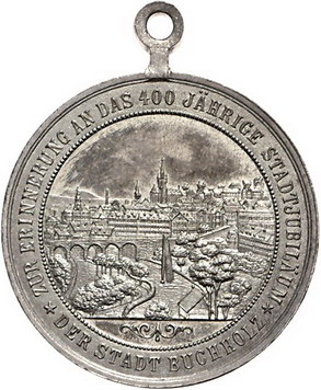 Los-Nummer: Auktion 51 - 1600 Altdeutsche Münzen und Medaillen Sachsen-Buchholz, Stadt Versilberte Bronzemedaille 1901. Auf das 400jährige Stadtjubiläum. Stadtansicht / Wappen. 30 mm. Originalöse. Vorzüglich - Stempelglanz Schätzpreis: 75,- Zuschlag: 80,- |