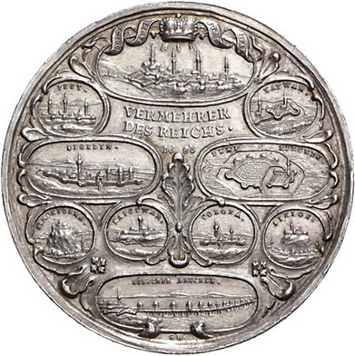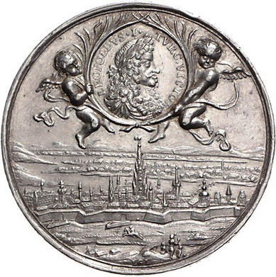 Los-Nummer: Auktion 51 - 2106 Haus Habsburg Haus Habsburg Leopold I. 1657-1705, Medaille 1686, von G. Hautsch. Auf die Siege des Jahres über die Türken. Zwei Engel halten Medaillen mit dem Porträt Leopolds über Stadtansicht von Wien / In zehn Medaillons die Orte der siegreichen Schlachten in Ungarn. Slg. Montenuovo 1027. Slg. Julius 309. Mit Randschrift. 40 mm, 26,0 g. Kl. Randfehler, Felder geglättet, vorzüglich Schätzpreis: 250,- Zuschlag: 360,- |