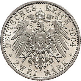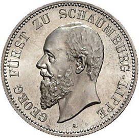 Los-Nummer: Auktion 51 - 2717 Münzen des Deutschen Kaiserreichs Schaumburg-Lippe Georg 1893-1911, 2 Mark 1904 A. Jaeger 164. Prachtexemplar. Winz. Kratzer, Stempelglanz Schätzpreis: 600,- Zuschlag: unverkauft |