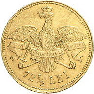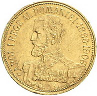 Los-Nummer: Auktion 51 - 3661 Ausländische Münzen und Medaillen Rumänien Carol I. 1866-1914, 12 1/2 Lei 1906. Auf sein 40jähriges Regierungsjubiläum. Friedberg 8, Schlumberger 10. GOLD. Sehr schön Schätzpreis: 150,- Zuschlag: 320,- |