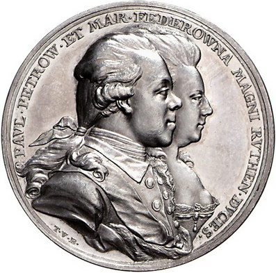 Los-Nummer: Auktion 51 - 3739 Ausländische Münzen und Medaillen Russland Katharina II. 1762-1796, Medaille 1782, von Th. van Berckel. Auf den Besuch des großherzoglichen Paares Paul Petrovich und Maria Feodorovna in Brüssel. Beider Brustbilder nach rechts / Attribute der Wissenschaft, der Schönen Künste und des Militärs. Diakov 191. 41 mm, 27,7 g. Fast Stempelglanz Schätzpreis: 1000,- Zuschlag: Z |
