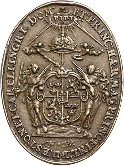 Los-Nummer: Auktion 51 - 3939 Ausländische Münzen und Medaillen Schweden Christina 1632-1654, Ovale Bronzegussmedaille o.J. (1650). Auf ihre Krönung in Stockholm. Reich verziertes Brustbild mit Strahlenkrone fast von vorn / Zwei Engel halten Krone über von Justitia und Prudentia flankiertem Wappen. Hildebrand zu I. s. 282,49. 60 x 45 mm. Späterer Guss. Sehr schön + Schätzpreis: 175,- Zuschlag: 220,- |