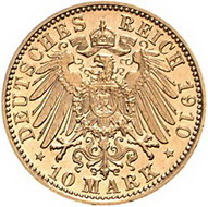 Los-Nummer: Auktion 51 - 2597 Münzen des Deutschen Kaiserreichs Bayern Otto 1886-1913, 10 Mark 1910 D. Jaeger 201. GOLD. Erstabschlag. Leichte Kratzer, vorzüglich / Stempelglanz Schätzpreis: 175,- Zuschlag: unverkauft |