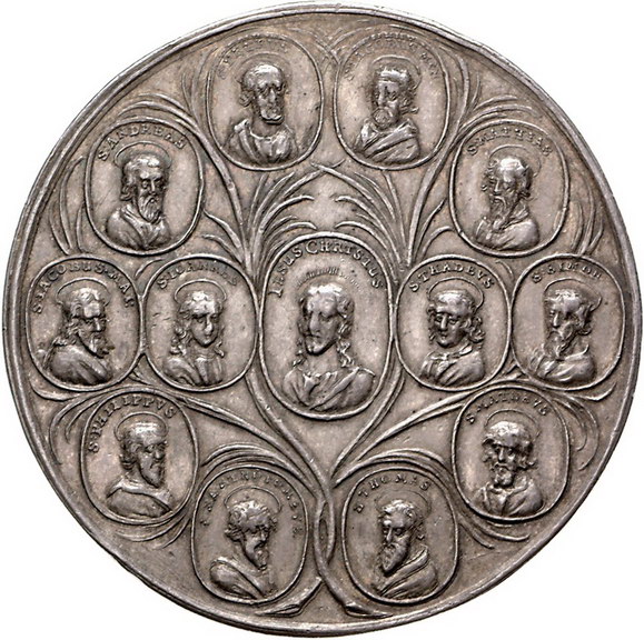 Los-Nummer: Auktion 51 - 2466 Medaillen Religion Allgemein Medaille o.J. (17. Jahrhundert). Jesus umgeben von zwölf Aposteln / Zwölf Zeilen Schrift. Slg. Goppel -. 60 mm, 56,60 g. Schöne Patina. Fast vorzüglich Schätzpreis: 250,- Zuschlag: unverkauft |