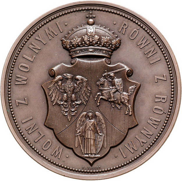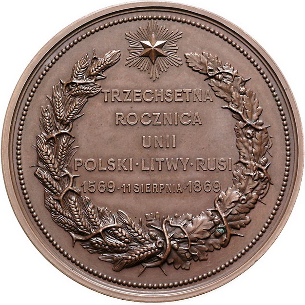 Los-Nummer: Auktion 51 - 3607 Ausländische Münzen und Medaillen Polen Alexander II. von Russland 1855-1881, Bronzemedaille 1869, von Tasset. Zum 300jährigen Gedenken an die Lubliner Union. Gekröntes dreiteiliges Wappen / Schrift in einem Kranz aus Ähren und Eichenzweigen. Mit Randschrift: BABINSKIEMU Józefowi. 64 mm. Vorzüglich + Schätzpreis: 400,- Zuschlag: 400,- |