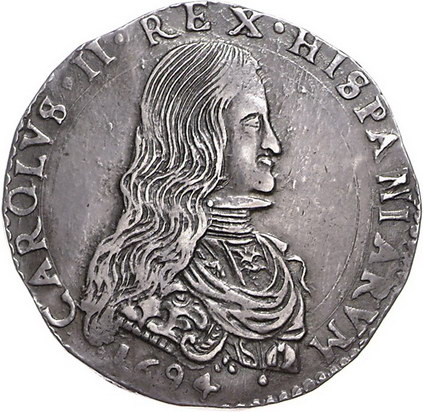 Los-Nummer: Auktion 51 - 3210 Ausländische Münzen und Medaillen Italien-Mailand Karl II. von Spanien 1665-1700, Filippo 1694. Brustbild nach rechts / Gekröntes Wappen. Crippa 4, Davenport 4007. Schöne Patina. Fast vorzüglich Schätzpreis: 900,- Zuschlag: unverkauft |