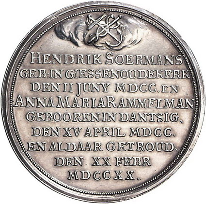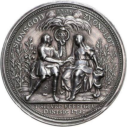 Los-Nummer: Auktion 51 - 3633 Ausländische Münzen und Medaillen Polen-Danzig Medaillen und Marken, Medaille 1745, von Holtzhey. Auf die Silberne Hochzeit von Hendrik Soermans und Anna Marie Rammelmann. Das Jubelpaar sitzt unter Palme, der Mann hält in seiner Linken Schlangenring mit 'XXV' empor / Anker und Merkurstab in Wolken über neun Zeilen Schrift. Slg. Marienburg 8868 (Br.), H.-Cz. 4038, Dutkowski/Suchanek 657. 43,5 mm, 30,59 g. Felder berieben, winz. Randfehler, vorzüglich Schätzpreis: 200,- Zuschlag: unverkauft |