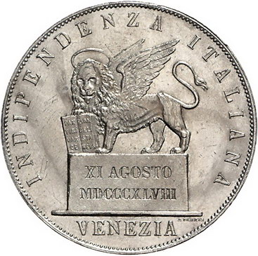 Los-Nummer: Auktion 51 - 2213 Haus Habsburg Haus Habsburg Italienische Revolution 1848, 5 Lire 1848. Aufstand in Venedig. Herinek 9, Davenport 208, KM 85. Vorzüglich - Stempelglanz Schätzpreis: 400,- Zuschlag: 360,- |