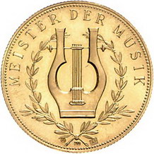 Los-Nummer: Auktion 51 - 2416 Medaillen Musiker Lortzing, Albert Gustav *1801 Berlin, +1851 Berlin, Goldmedaille o.J. (1957), von Hartig. Kopf von vorn / Lyra zwischen Lorbeerzweigen. Niggl 1204 b. 22,5 mm, 8,0 g (900er). GOLD. Fast Stempelglanz Schätzpreis: 225,- Zuschlag: 180,- |