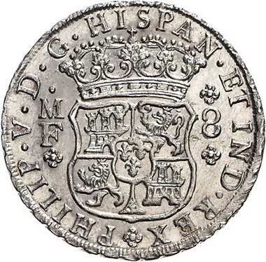 Los-Nummer: Auktion 51 - 3430 Ausländische Münzen und Medaillen Mexiko Felipe V. 1700-1746, 8 Reales 1744 F, Mexiko. Zwei Globen unter Krone zwischen den Säulen des Herkules / Gekröntes Wappen. Calicó/Trigo 707. Vorzüglich Schätzpreis: 400,- Zuschlag: unverkauft |