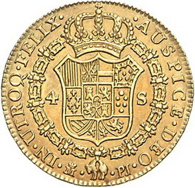 Los-Nummer: Auktion 51 - 4020 Ausländische Münzen und Medaillen Spanien Carlos III. 1759-1788, 4 Escudos 1777 PJ, Madrid. Calicó/Trigo 213, Friedberg 284. GOLD. Sehr schön - vorzüglich Schätzpreis: 600,- Zuschlag: 480,- |