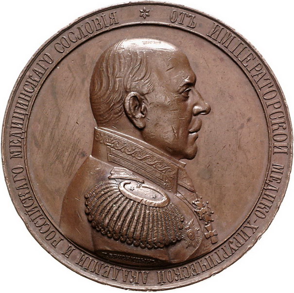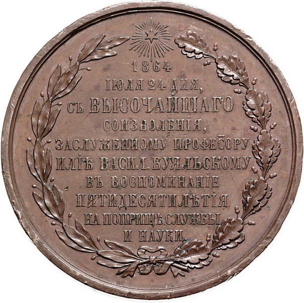 Los-Nummer: Auktion 51 - 3832 Ausländische Münzen und Medaillen Russland Alexander II. 1855-1881, Bronzemedaille 1864, von Brusnitsyn. Auf das 50jährige Dienstjubiläum von I.V. Buyalsky (1789-1864), Generalstabsarzt in St. Petersburg. Brustbild nach rechts / Schrift in Kranz. Diakov 728.1 (R1), Smirnov 658 , Slg. Brettauer 178. 62 mm. Randfehler, sehr schön Schätzpreis: 75,- Zuschlag: 60,- |