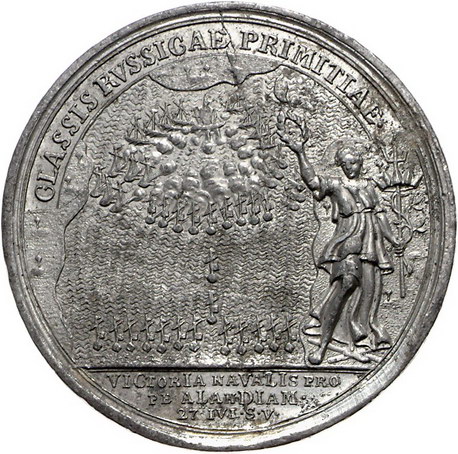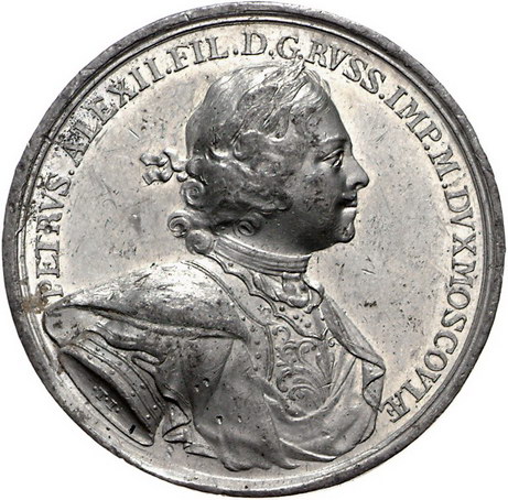 Los-Nummer: Auktion 51 - 3687 Ausländische Münzen und Medaillen Russland Peter der Große 1689-1725, Zinnmedaille 1714, von Ivanov. Auf den Seesieg bei Gangut. Brustbild des Zaren nach rechts / Viktoria mit Dreizack und Lorbeerkranz, im Hintergrund Ansicht der Seeschlacht. Diakov 47.18. 47 mm. Sehr schön Schätzpreis: 125,- Zuschlag: unverkauft |