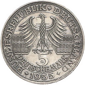 Los-Nummer: Auktion 51 - 2789 Bundesrepublik Deutschland 5 Mark 1955 G. Markgraf von Baden. Jaeger 390. Vorzüglich Schätzpreis: 175,- Zuschlag: unverkauft |