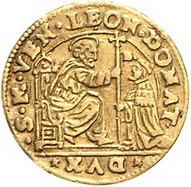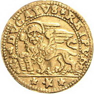 Los-Nummer: Auktion 51 - 3319 Ausländische Münzen und Medaillen Italien-Venedig Leonardo Donà 1606-1612, Ducato d'oro. 2,08 g. Doge kniet vor San Marco / Löwe. Gamberini 594, Friedberg -, Paolucci S. 80, 5. GOLD. Sehr schön Schätzpreis: 300,- Zuschlag: unverkauft |