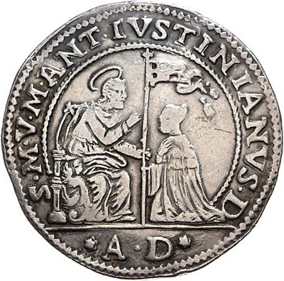 Los-Nummer: Auktion 51 - 3338 Ausländische Münzen und Medaillen Italien-Venedig Marc' Antonio Giustinian 1684-1688, Ducato. Münzmeister Antonio Dona. Gamberini 1069, Paolucci S. 109, 9. Kaum sichtbare Henkelspur, sehr schön Schätzpreis: 75,- Zuschlag: unverkauft |