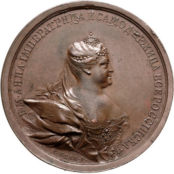 Los-Nummer: Auktion 51 - 3702 Ausländische Münzen und Medaillen Russland Anna Ivanovna 1730-1740, Bronzemedaille 1730, von Judin. Auf ihre Krönung in Moskau am 28.4.1730. Brustbild nach rechts / Die Personifikationen von Glaube, Hoffnung und Liebe überreichen der Zarin die Krönungsinsignien. Zweite Stempelschneidersignatur GFR auf dem Boden. Diakov 69.5. 61,5 mm. Dunkle Patina. Winz. Randfehler, vorzüglich Schätzpreis: 300,- Zuschlag: 800,- |