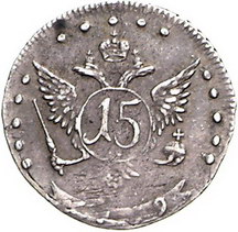 Los-Nummer: Auktion 51 - 3726 Ausländische Münzen und Medaillen Russland Katharina II. 1762-1796, 15 Kopeken 1769, Moskau. Harris 148, Bitkin 164. Etwas Korrosion, sehr schön Schätzpreis: 75,- Zuschlag: 65,- |