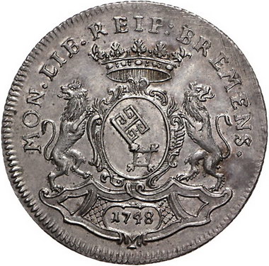Los-Nummer: Auktion 51 - 703 Altdeutsche Münzen und Medaillen Bremen, Stadt 1/2 Taler 1748. Von zwei Löwen gehaltenes, gekröntes ovales Wappen, darunter in einer Verzierung die Jahreszahl / Gekrönter Doppeladler mit Zepter, Schwert und Reichsapfel. Jungk 528. Vorzüglich Schätzpreis: 200,- Zuschlag: 160,- |