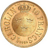 Los-Nummer: Auktion 51 - 3954 Ausländische Münzen und Medaillen Schweden Karl XV. 1859-1872, Carolin (10 Francs) 1869. S.M. 11, Friedberg 92. GOLD. Prachtexemplar. Fast Stempelglanz Schätzpreis: 500,- Zuschlag: unverkauft |