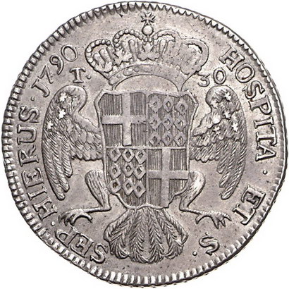 Los-Nummer: Auktion 51 - 3423 Ausländische Münzen und Medaillen Malta Emanuel de Rohan 1775-1797, 30 Tari 1790. Brustbild nach rechts / Gekröntes vierfeldiges Wappen vor kopflosem Adler. Restelli/Sammut 30, Davenport 1609. Sehr schön - vorzüglich Schätzpreis: 250,- Zuschlag: 260,- |